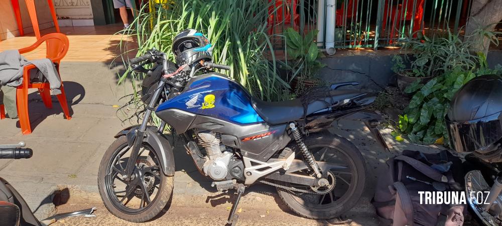 No local foi constatada a colisão envolvendo a motocicleta Honda / Star CG 160, de cor azul e a motocicleta Honda / Twister 250cc, de cor preta.
