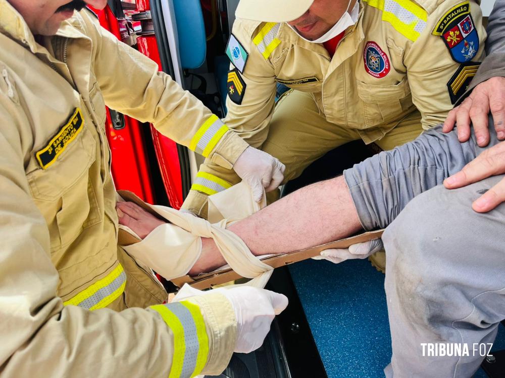 No local, foi constatado que um trabalhador havia caído de aproximadamente quatro metros de altura, sofrendo suspeita de fratura na perna direita, além de escoriações.