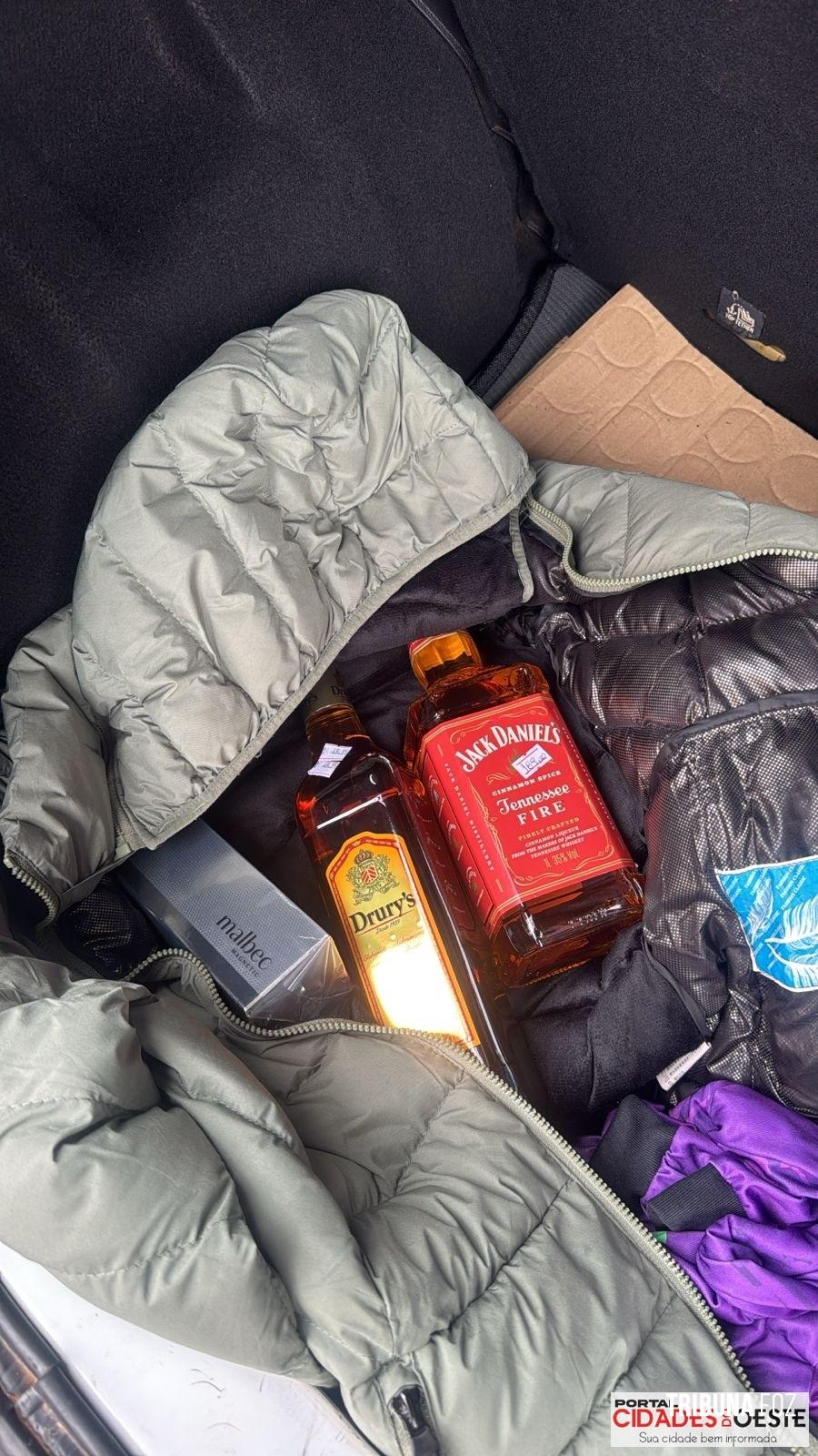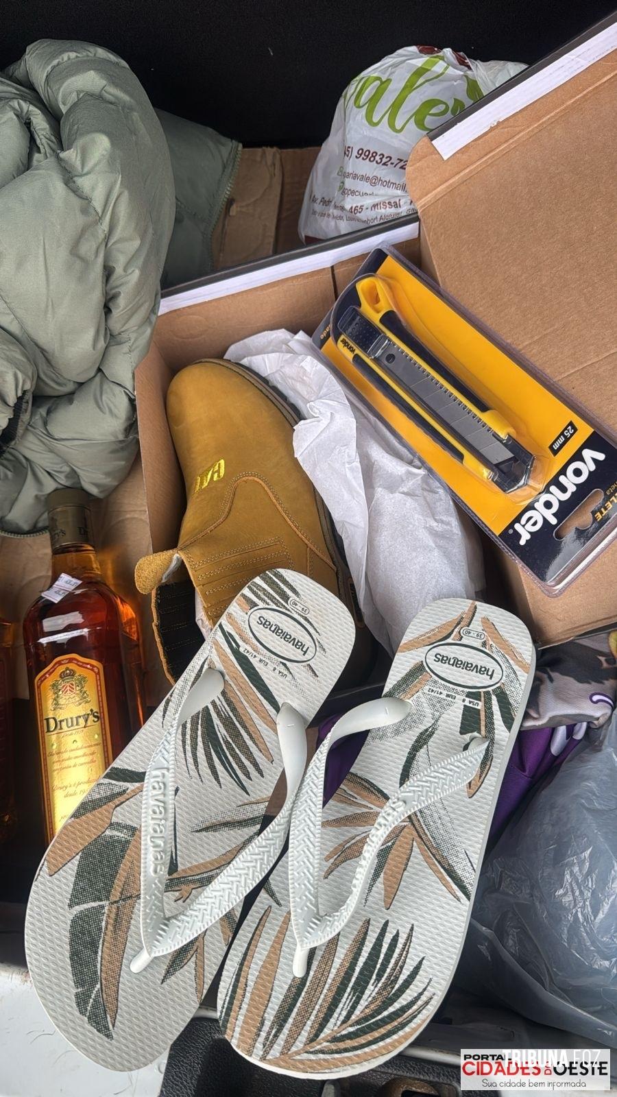 A equipe policial fez a abordagem e ao checar o interior do veículo, foram encontrados vários itens, entre eles, bebidas, perfumes e outros produtos que devem ser produto dos furtos praticados.