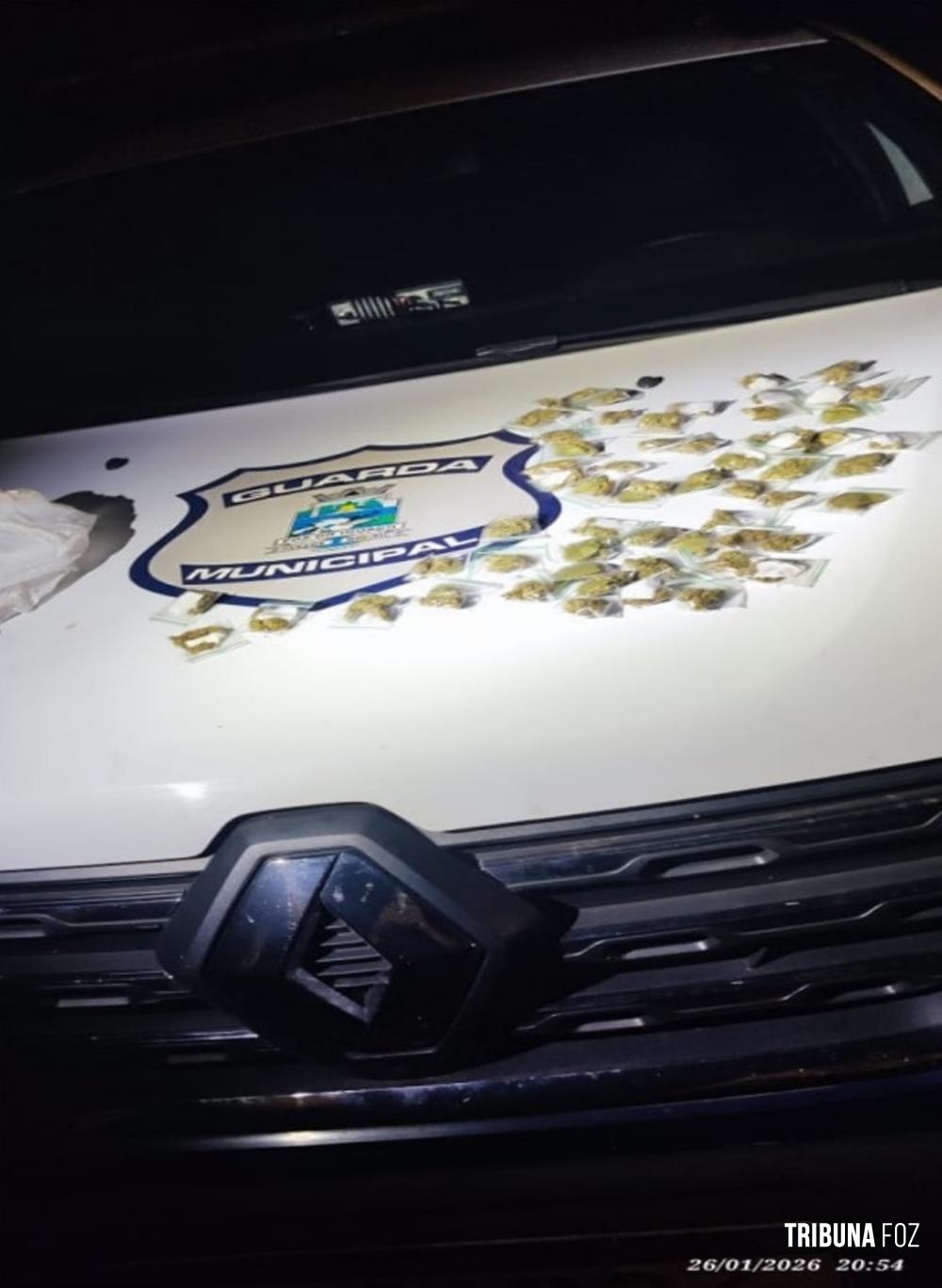 Durante buscas no local, os agentes localizaram uma sacola contendo 62 porções de substância análoga à maconha, totalizando cerca de 70 gramas. A equipe K9 da Guarda Municipal foi acionada para apoio, porém não foram encontradas outras substâncias ilícitas.