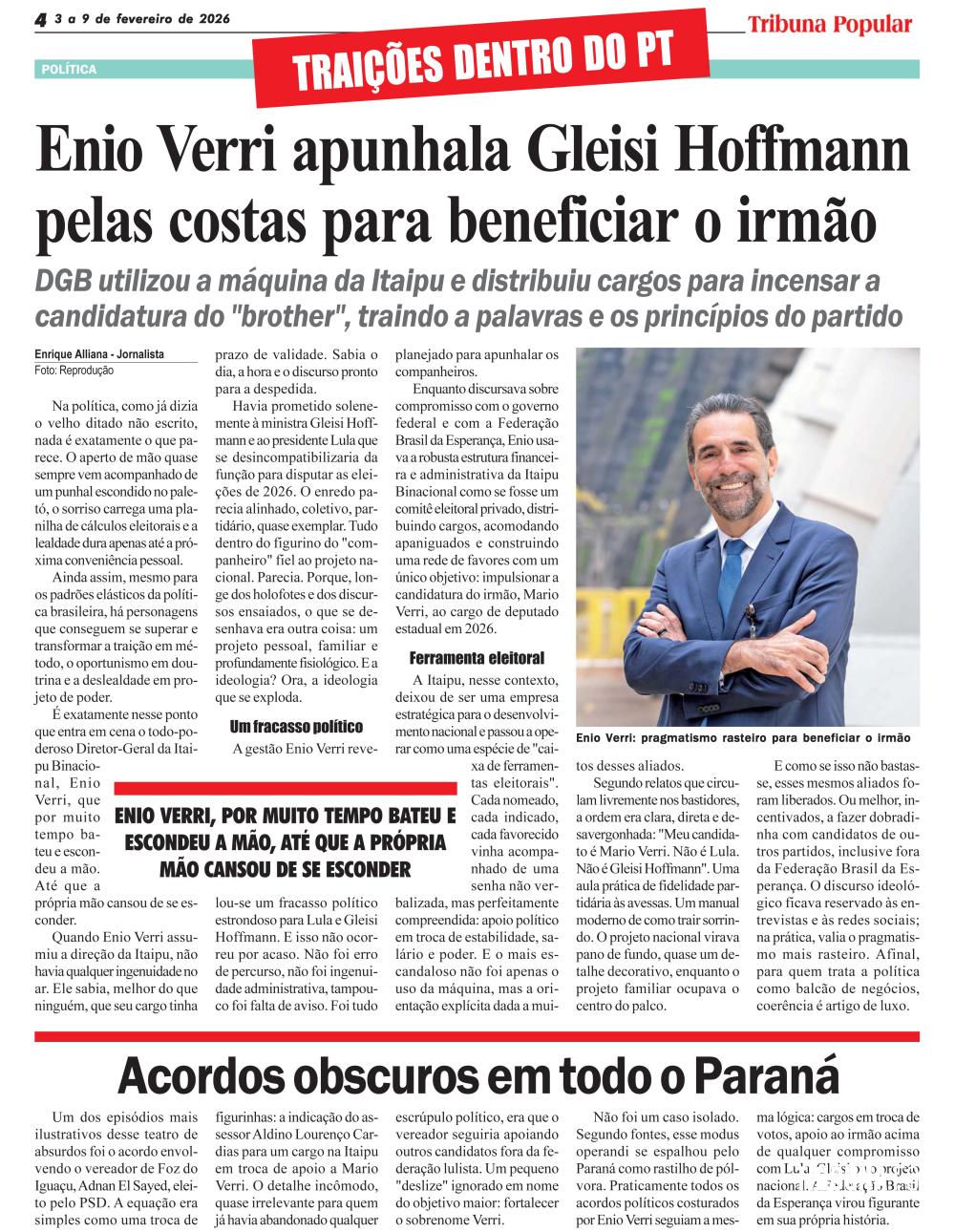 Não foi um caso isolado. Segundo fontes, esse modus operandi se espalhou pelo Paraná como rastilho de pólvora. Praticamente todos os acordos políticos costurados por Enio Verri seguiam a mesma lógica: cargos em troca de votos, apoio ao irmão acima de qualquer compromisso com Lula, Gleisi ou o projeto nacional. A Federação Brasil da Esperança virou figurante em sua própria história.