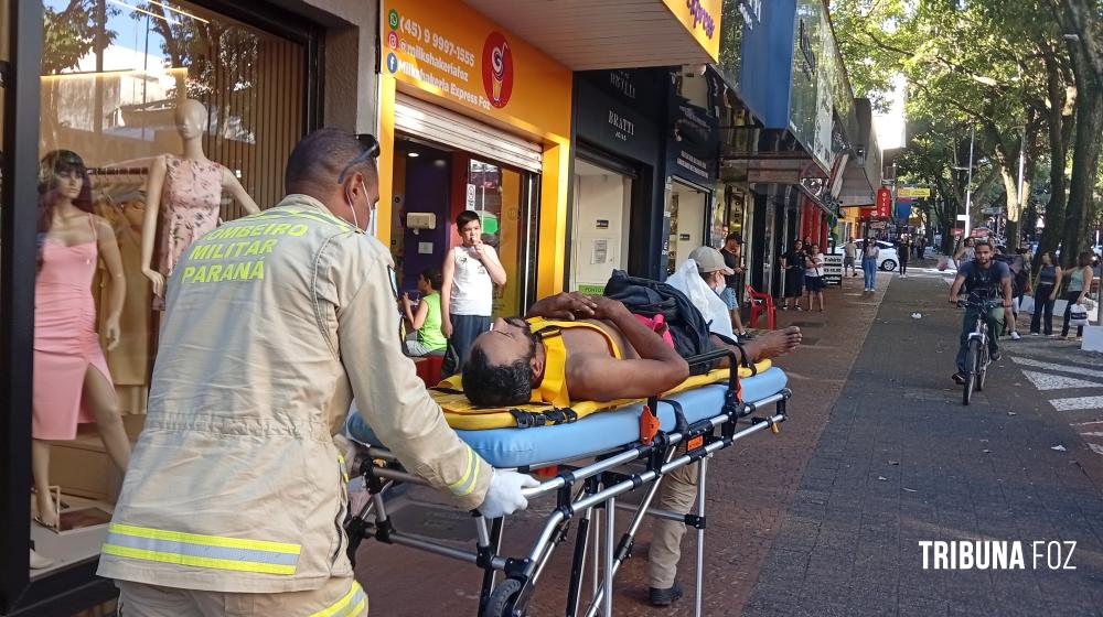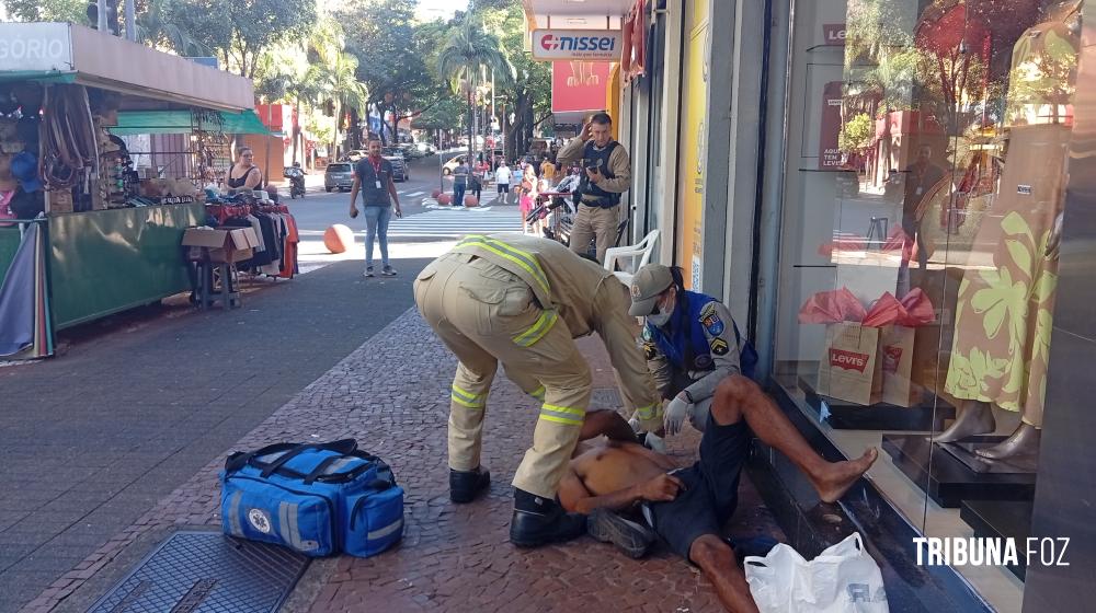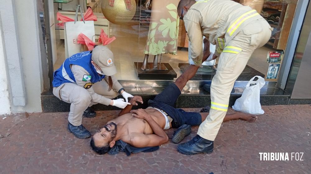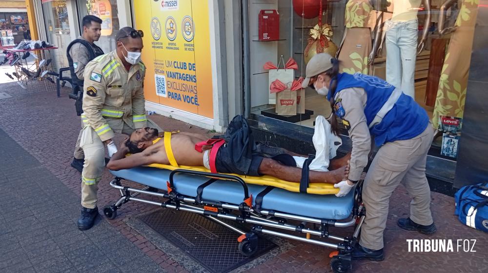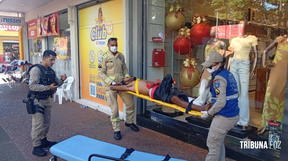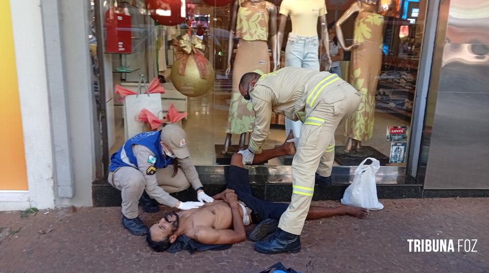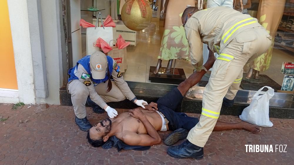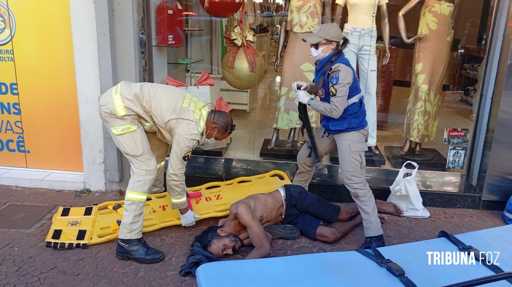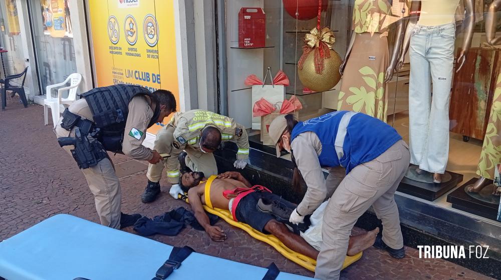 Na tarde desta sexta-feira, 19 de dezembro de 2025, por volta das 17h:15min, policiais militares do 14º Batalhão da Policia Militar de Foz do Iguaçu, quando patrulhavam a Avenida Brasil, quase cruzamento com a Rua Quintino Bocaiuva, área central da cidade, quando se depararam com uma pessoa estirada em frente as lojas vítima de agressão.