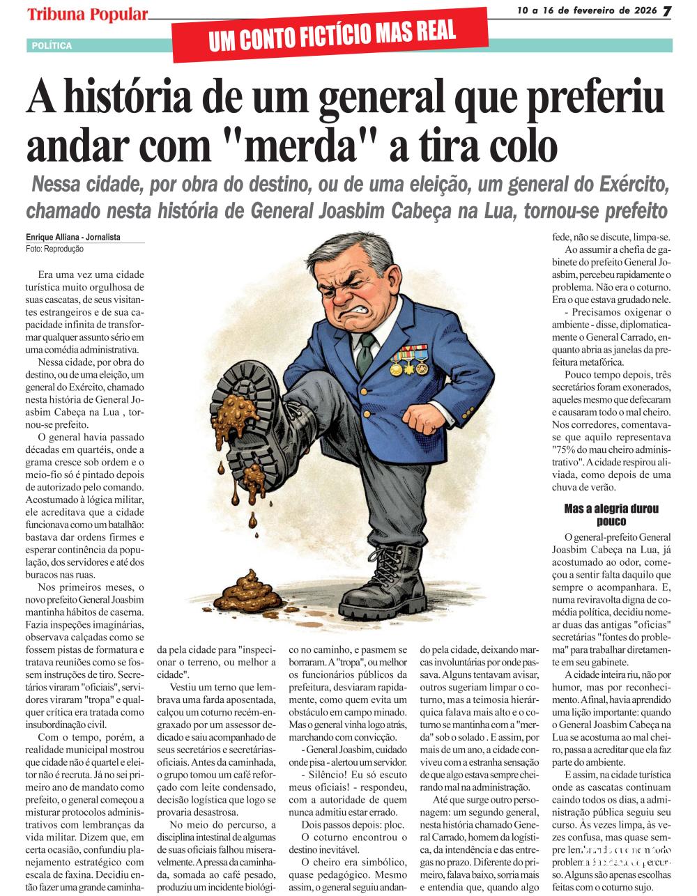 O coturno encontrou o destino inevitável. O cheiro era simbólico, quase pedagógico. Mesmo assim, o general seguiu andando pela cidade, deixando marcas involuntárias por onde passava. Alguns tentavam avisar, outros sugeriam limpar o coturno, mas a teimosia hierárquica falava mais alto e o coturno se mantinha com a "merda" sob o solado . E assim, por mais de um ano, a cidade conviveu com a estranha sensação de que algo estava sempre cheirando mal na administração.
