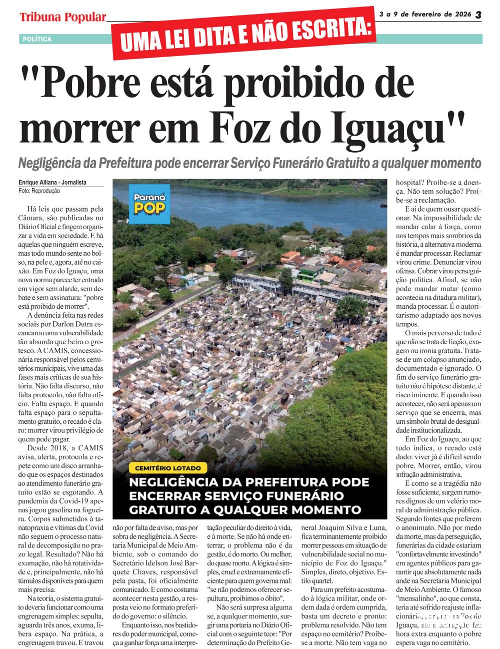 Em Foz do Iguaçu, ao que tudo indica, o recado está dado: viver já é difícil sendo pobre. Morrer, então, virou infração administrativa.