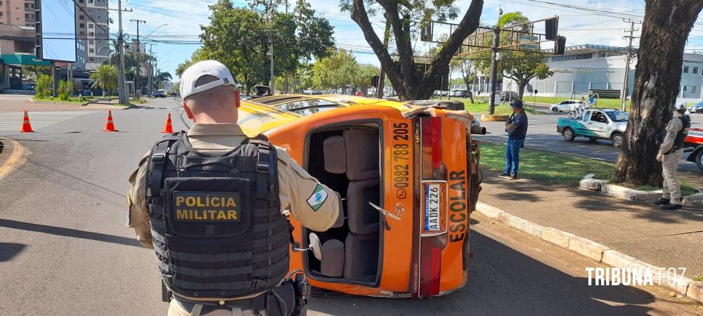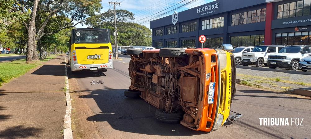 Van escolar tomba após ser colhida por um ônibus do transporte público internacional na Av. Paraná
