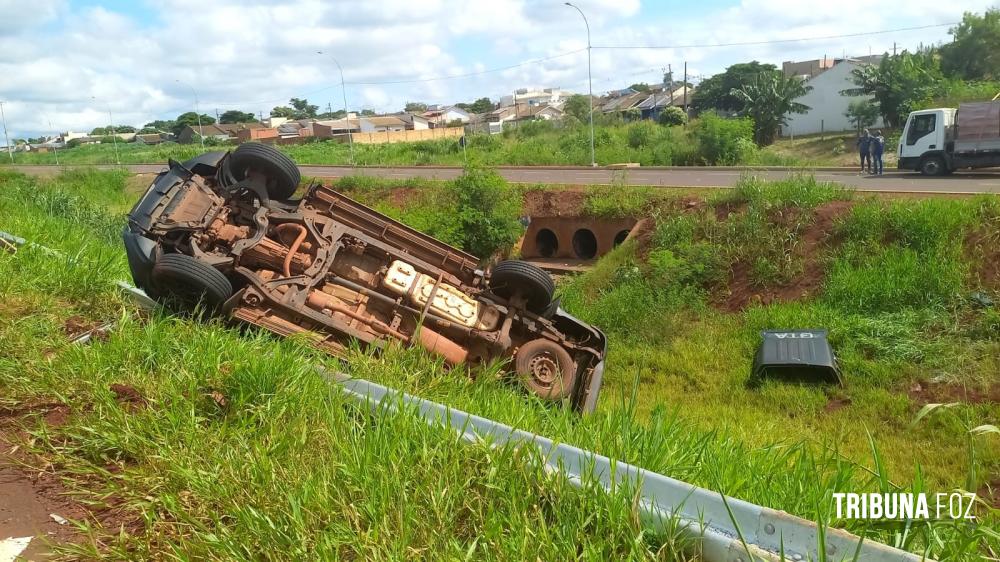 Viatura da Guarda Municipal de Foz do Iguaçu capota durante deslocamento na Av. Perimetral Leste