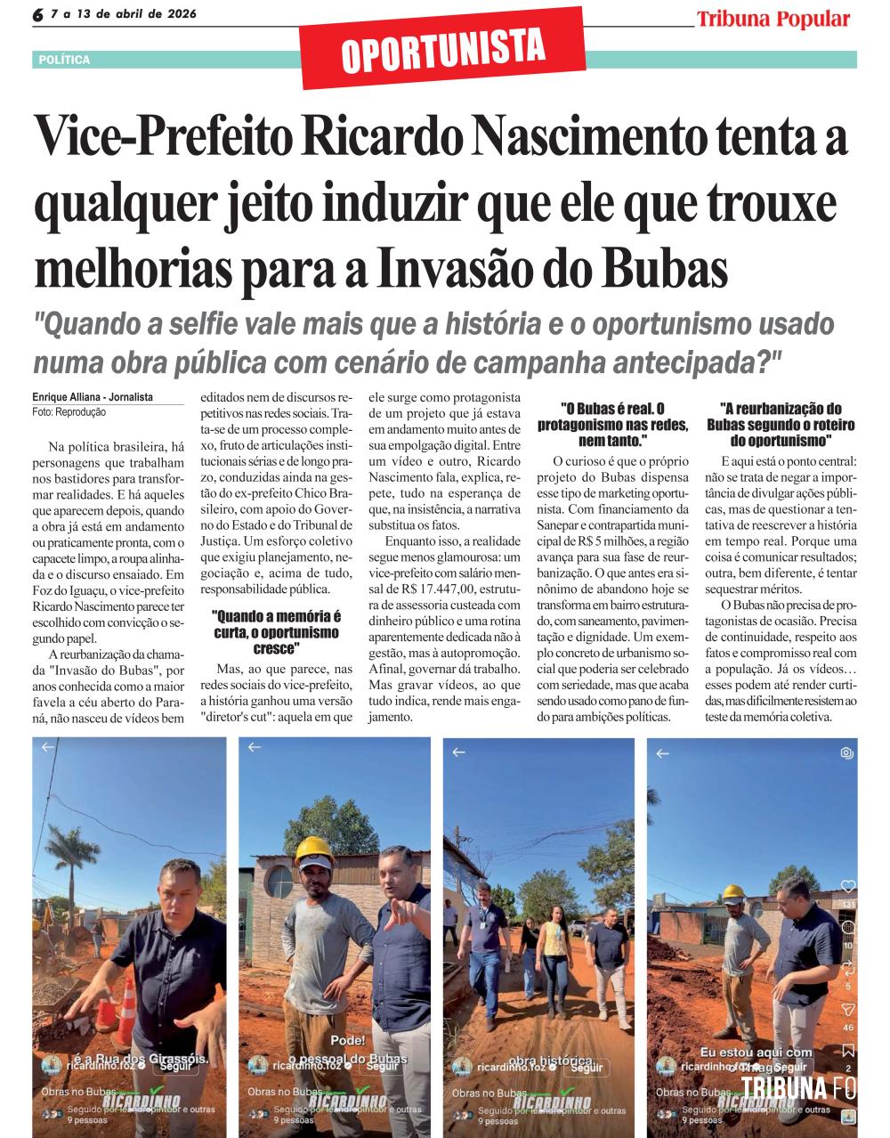 Na política brasileira, há personagens que trabalham nos bastidores para transformar realidades. E há aqueles que aparecem depois, quando a obra já está em andamento ou praticamente pronta, com o capacete limpo, a roupa alinhada e o discurso ensaiado. Em Foz do Iguaçu, o vice-prefeito Ricardo Nascimento parece ter escolhido com convicção o segundo papel.
