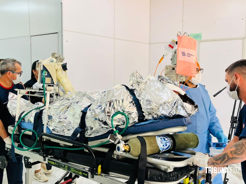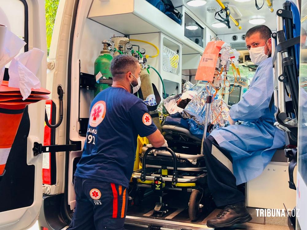 Na tarde de ontem, sexta-feira 27 de fevereiro de 2026, a equipe do SAMU realizou a transferência da vítima da explosão registrada em um apartamento no bairro Vila Yolanda, em Foz do Iguaçu.